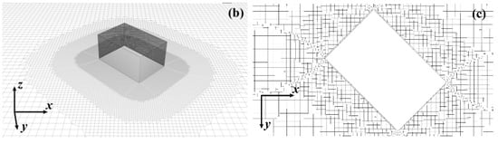 Mesh system of the domain with an isolated building for a 45-degree angle: (a) the crosswise slice of the whole domain, (b) the mesh of building, and (c) the horizontal slice of the building mesh. The x-direction for the streamwise direction, y for the crosswise direction, and z for the vertical direction.