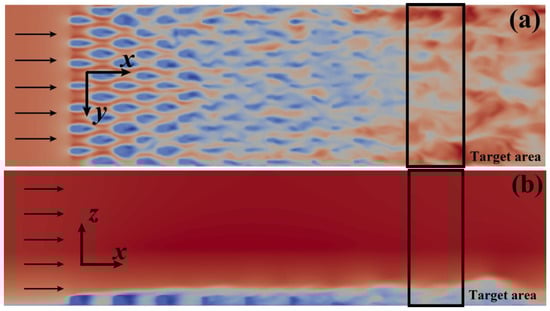 Streamwise velocity field (a) in the near ground at height = 0.05 m and (b) in the crosswise central plane. The colors from blue to red represent the streamwise velocity from zero to high value. The velocity field in the target area is used for reshaping inflow velocity profile.