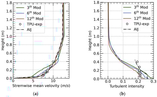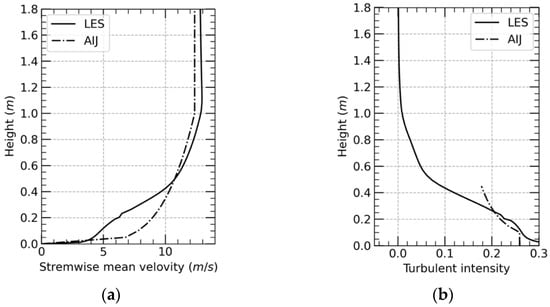 (a) The streamwise mean velocity profile and (b) the turbulence intensity profiles within the target area using virtual roughness blocks, AIJ profiles are plotted as reference.