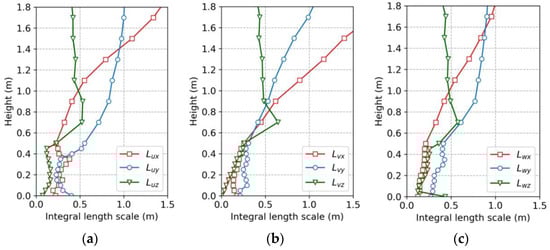 The vertical profiles of the integral length scales of the numerical turbulence field. (a) the profiles of streamwise velocity (b) the profiles of crosswise velocity (c) the profiles of vertical velocity.
