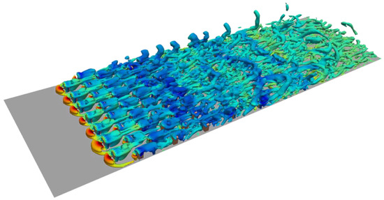 Topology of vorticities over virtual roughness blocks expressed by Q-criterion. The vorticities are colored by instantaneous pressure.