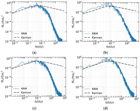Power spectrum of longitudinal (left side, (a) Height = 0.05 m, (c) Height = 0.10 m) and cross (right side, (b) Height = 0.05 m, (d) Height = 0.10 m) fluctuating wind components.