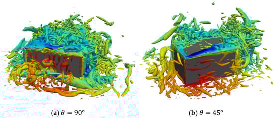 The isolated building is impacted by the turbulence field for two angles of attack, θ = 90° and θ = 45°, respectively. The instantaneous velocity field for the last timestep is recorded to analyze the turbulence characteristics around buildings. The topology of vorticities around the isolated building for the two attack angles is shown in Figure 11, and the vorticity is identified by the Q criteria. As we can see, for the attack angles equal to 90°, the flow is evenly separated at the edges of the windward side; for the attack angles equal to 45°, the flow is firstly divided into two parts by the front edge, then the two flows develop downstream along the top edges of the two side surfaces, and finally form the spiral flows.