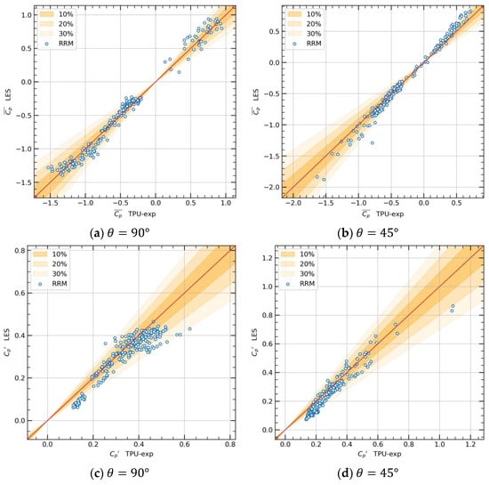 To make a clearer evaluation of the obtained numerical results, the experimental measurements and numerical data for each pressure probe are plotted in a correlation diagram. Figure 14a,b shows the correlation of the time-average surface pressure coefficient for attack angles equal to 90° and 45°, respectively, while Figure 14c,d shows the fluctuation results of surface pressure coefficient, and the distribution of correlated points is quantified in Table 1. For all four groups of data, the correlated points are generally located along the diagonal. Regarding the time-average pressure results, for two attack angles, nearly 90% of correlated points are located in the tolerance range of 30%, which represents a high accuracy of the LES simulation. For the fluctuating pressure result, the larger deviation between experiment and simulation is once again proven by the correlation analysis, in which the percentage of points in the 30% tolerance range is equal to 85.8% and 76.7%, respectively. However, although there are some differences between the two results, the general characteristics of the wind-induced surface pressure obtained by LES can be considered in good accordance with the wind tunnel results over the whole building surface. Such results indicate that the numerical turbulence field generated by RRM is capable of the analysis of aerodynamic characteristics on buildings.