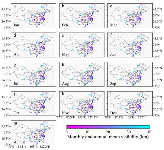 Spatial distributions of monthly and annual visibility during 2010–2020.