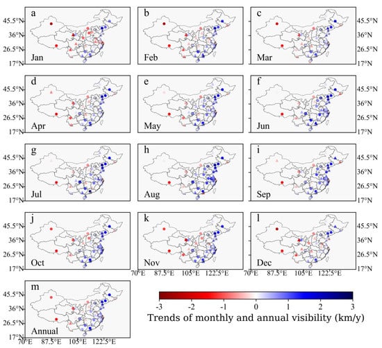 Spatial distributions of the trends of monthly and annual visibility during 2010–2020. Triangles represent statistically significant trends (p < 0.05).
