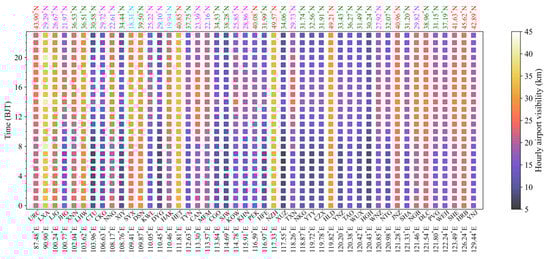 For all airports, good visibility mainly occurs between 14:00–18:00 p.m., while poor visibility mainly concentrates from 22:00 p.m. to 12:00 p.m. the next day, especially between 3:00–9:00 a.m. It can be seen that the visibility of the airport is the poorest in the early morning and morning. In the early morning and morning, poorest visibility occurs at CTU (in Chengdu), XIY (in Xian), DYG (in Zhangjiajie), XUZ (in Xuzhou) and HGH (in Hangzhou), which concentrate between 29° N and 35° N. Within the same longitude range, airports with latitude more than 40° N have better visibility, such as HET, NZH and HLD located in 110° N–120° N, and JNZ, SHE and HRB located in 121° N–130° N.