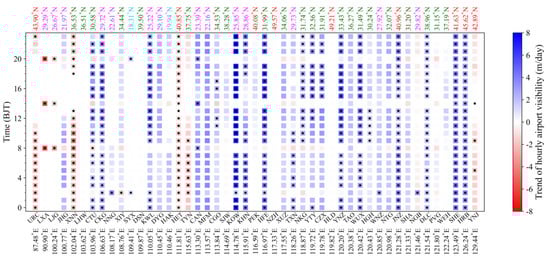 The visibility at most airports shows a positive trend at most times. Similar to Figure 4, the increasing visibility mainly occurs in most international airports of China, while decreasing visibility mainly appears in the western and northern parts of China. KOW, KHN (in Nanchang), HFE (in Hefei), SHE (in Shenyang) and HRB (in Harbin) own the greatest and most significant positive trends during all day, while the greatest and most significant negative trends can be found at XNN (in Xining), URC, HET (in Hohhot), LXA and LJG (in Lijiang). In several airports showing a negative trend of visibility (e.g., URC, XNN, TYN and YNJ), the visibility during 14:00–17:00 p.m. has not changed, and the negative trend mainly appears in other times except this time period. Although LXA has the most significant visibility negative trend, unlike most other airports visibility with negative trend (e.g., XNN, URC and HET), LXA has a significant negative trend at only three times (8:00 a.m., 14:00 p.m. and 20:00 p.m.), and there is basically no change in other times. LJG also has the same visibility variation situation. The hours of 8:00 a.m., 14:00 p.m. and 20:00 p.m. are special for visibility at all airports. Compared with the visibility at different times at the same airport, the visibility at these above three times shows opposite or small changes in some airports. On the whole, the hourly visibility changes are the same in a day, showing the same increase and decrease.