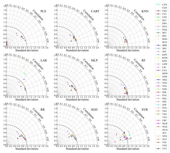 The standard deviation ratios of most airports under CART, KNN, MLP, RF, RR and SGD are close to 1, indicating that under these algorithms, the dispersion degrees of predicted and observed visibility are close (Figure 9).
