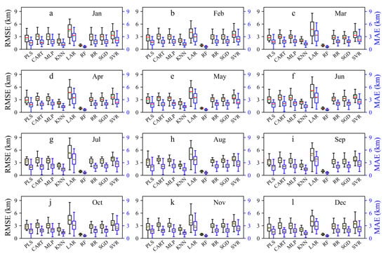 RMSE (black box) and MAE (blue box) between hourly visibility observations and estimates at 47 airports in the testing period (2020).