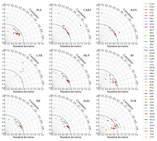 All hourly samples of 26 meteorological elements in 2018–2019 are used to train airport visibility estimation models proposed in this study. Except for LAR, most models are universal to all airports and perform well, and obtain mean Spearman correlation coefficient (CC) values of 0.75, 0.91, 0.96, 0.90, 0.97, 0.91, 0.88 and 0.90 for the PLS-, CART-, KNN-, MLP-, RF-, RR-, SGD- and SVR-based models, respectively (Figure 7).