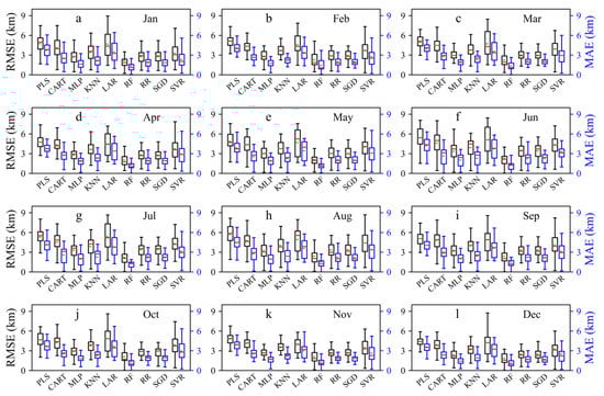 If the standard deviation ratios are dispersed around 1, it means that there is a great difference in the dispersion between the predicted and observed under these algorithms, e.g., LAR and SVR. Under the RF-based model, the CC values at most airport visibility are the highest, and there is the closest degree of dispersion between the predicted and observed. Therefore, the RF-based model has the best prediction effect among several algorithm models. The above description can also be seen from the RMSE and MAE values of each month; that is, RF has the best effect (the lowest RMSE and MAE in all months) (Figure 10). RMSE and MAE are higher in May–September and lower in October–December, indicating that the forecast results of visibility in May–September are worse and in October–December are better than those in other months.