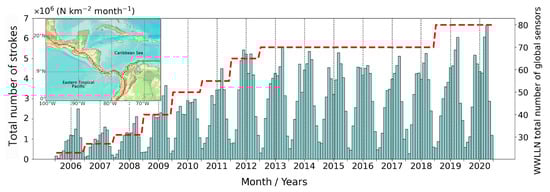 Total number N of strokes km−2 month−1 over the Extended Central America (ECA) region (inserted panel), and the total number of World Wide Lightning Location Network (WWLLN) sensors for each year of 2006–2020. The red broken line is the WWLLN global average number of sensors per year, approximately. The dotted red line separates, using the mountain peaks of ECA, the Caribbean, the eastern tropical Pacific basins from the northern part of South America.