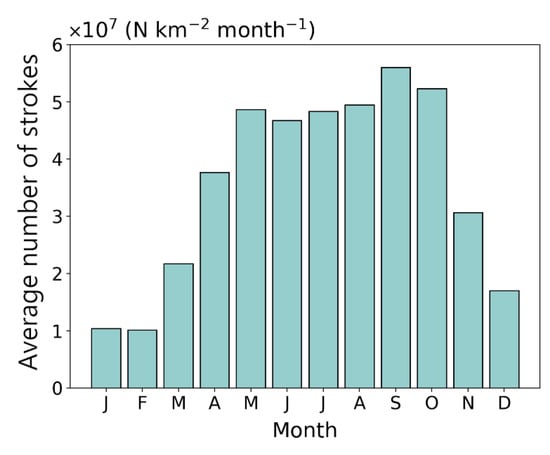 Average monthly lightning density (N km−2 month−1) over the ECA for 2012–2020. Data from the World Wide Lightning Location Network (WWLLN).