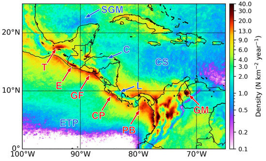 The monthly average of lightning density distribution in the ECA is shown in Figure 3. The regions with the largest lightning density (named here “hot-spots”), using the density magnitude in ascending order are: the Panama Bight in Panama (PB; D~21.84 N km−2 year−1); the Central Pacific of Costa Rica (CP; D~23.45 N km−2 year−1); the Gulf of Fonseca between El Salvador, Honduras and Nicaragua (GF; D~25.18 N km−2 year−1); Tehuantepec in Mexico (T; D~26.11 N km−2 year−1); Escuintla in Guatemala (E; D~37.57 N km−2 year−1) and the Gulf of Maracaibo in Venezuela (GM; D~40.82 N km−2 year−1). This last finding of a regional maximum of lightning strokes in the so-called region of the “Relámpago del Catatumbo”, is notoriously consistent, except for its density values, with the works of [12,29]. As reported by [12], the Lake Maracaibo Basin in north western Venezuela has the highest annual lightning rate of any place in the world (~200 N km−2 year−1), using the LIS/OTD satellite data for north western South America, which is more than four times the density found here for the same region. Differences may be due to the fact that the WWLLN is good at detecting mainly cloud to ground lightning [55], while the data managed by [12] contains both, cloud to ground and intra-cloud lightning.