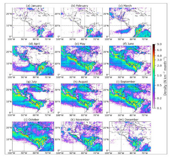 Average monthly distribution of lightning activity (total number N of strokes km−2 month−1) over the Extended Central America region for 2012–2020. Data from the World Wide Lightning Location Network (WWLLN).