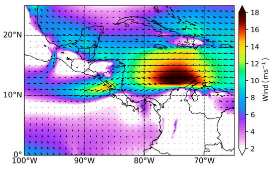 Average July monthly wind speed at 925 hPa from ERA5 over the Extended Central America for 2012–2020. (https://climatedataguide.ucar.edu/climate-data/era5-atmospheric-reanalysis, accessed on 12 May 2021).