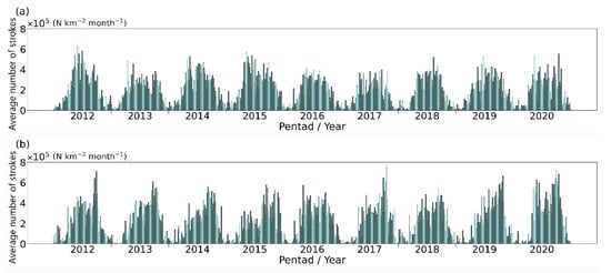 Average monthly distribution of lightning activity (total number of N km−2 month−1) over (a) the eastern tropical Pacific, and (b) the Caribbean Sea using the World Wide Lightning Location Network (WWLLN) data each year of 2006–2020.
