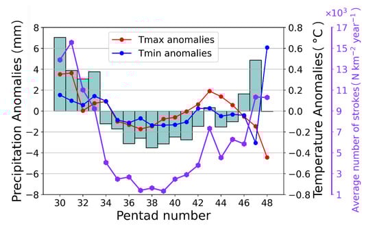 To simply test the above relationships between Tmax, Tmin, convective precipitation, and lightning in that region, Figure 7 was generated. This figure shows ERA5 data for the period June–July–August (2012–2020) for a single grid point near 11° N, 86° W located between La Cruz (Costa Rica), and San Juan del Sur (Nicaragua), assuming that it is representative of mean conditions for the near a land-continental area. Anomalies were estimated following the standard procedure and pentad values (5-day periods) begin in June (pentad 30), and end in August (pentad 48). All pentad averages for all variables were estimated using ERA5 and WWLLN data at the 15 × 15 grid-box area defined above for the period 2021–2020. As can be observed in that figure, the precipitation anomalies are positive during pentads 30 to 33–34 corresponding approximately to the third week of June and to the first peak of the rainy season. During this period D is a relative maximum. Negative precipitation anomalies are present from pentads 34–35 to 45 approximately, corresponding to the interval from late June to mid-August approximately, when D is a minimum. This phase of the precipitation pattern has been associated with the MSD. After pentad 46, Figure 7 shows the beginning of the second rainy period in that region, so lightning increases. With respect to extreme temperatures, Tmax and Tmin behave in agreement with a relatively long interval of negative precipitation anomalies (pentads 34 to 42), after which on average, Tmax raises and Tmin diminishes for at least 3–4 pentads. Although this is not conclusive, it brings attention to test the proposed mechanisms with observed data for a larger area in the future.