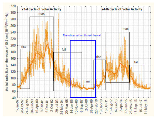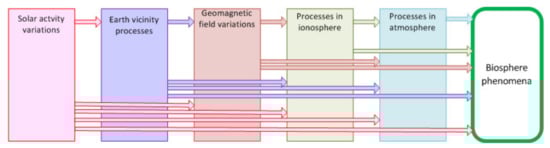 Additionally, it is necessary to take into account the mutual inter-influence of natural processes, as well as their ability to affect a living organism both comprehensively and consistently. The mutual connections of the environmental processes are well-known. They have been carefully investigated in the past and are under investigation now [31,32,33,34,35,36,37,38,39,40,41,42]. It is well-known that the particle fluxes behavior in the inter-planet space, and particularly in Earth’s vicinity, named the near-Earth space or Geospace [31,32] in the radiation belts, is governed by solar wind [31]. The intensive solar cosmic rays can affect the high-energy galactic cosmic rays fluxes. As the result, the density and speed of different particles in the radiation belts vary in a wide range that affects the magnetosphere and ionosphere status. Additionally, the separate events—solar coronal mass ejection (CME)—can affect the magnetosphere [33]. The magnetosphere–ionosphere interactions [34,35] give additional complexity to the cosmic impact on the Earth. Additionally, we must take into account the reconnections of the geomagnetic field lines after the external impact and the interaction of the “frozen into” solar wind magnetic field with the geomagnetic field. The recent information from a satellite group (Cluster) about the chemical elements in Earth’s vicinity [32] leads to a more complicated scheme of the above-mentioned interaction. Additionally, the atmosphere is involved into these interactions. The atmosphere part in these processes has been investigated now for a long time from two sides—(1) the atmosphere processes as a factor for the electron precipitation [36] in the sub-auroral polarization stream (SAPS) [35] and (2) the atmosphere as the object undergoes Space Weather impact [37,38,39]. The concrete response of the Earth’s atmosphere to the above-mentioned impact is shown by different research from the different points: the troposphere changes [40], thermosphere processes [41], and the polar vortex form changing [42].
