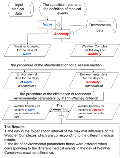 - At the next step, we collect the environmental parameters—as many as we can get from all the different environmental fields—those characterizing the calendar date of the registration of a specific medical event. Thereby, we form the complexes of environment characteristics (named the “Weather Complex” in this work) presumably affecting the object under study.