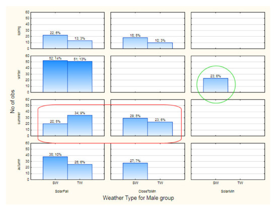 - The sets of environmental parameters, which correspond to the days of registration of different categories of medical events (Middle vs. Nobody), are obviously clusters that are already formed according to a given condition: compliance with a specific medical event under study. Thus, we come to one of the tasks of Cluster Analysis: the determination of inter-cluster distances and the allocation of the maximum of them. The Euclidean inter-cluster distance we used was defined aswhere and are the studied clusters of environmental parameters sets that were registered in days of concrete different medical events, n is the number of their members and and are the values of standardized (in this paper for the seasonal median) values of environmental parameters—members of the corresponding clusters.