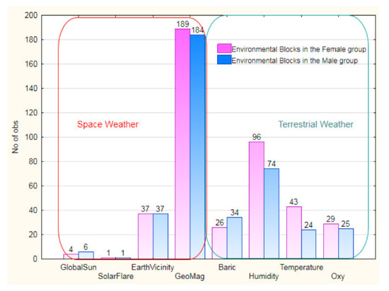 - People belonging to the different gender groups may respond to different characteristics of variations (daily statistics) of the same environmental parameters. For example, women may respond to a maximum value (or any point statistic) of this parameter but not men in a daily spread of this quantity.