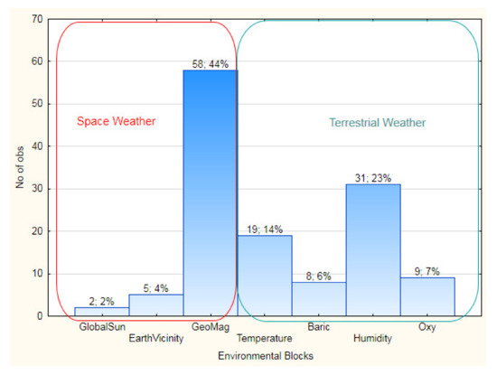Based on the proposed scheme, the structure of the studied complex of environmental factors is formed. The Weather Complex consists of two blocks—(1) Space and (2) Terrestrial Weather, divided into the listed subblocks (“Weather Complexes Blocks” in this work). The proposed scheme has the following advantages: (1) it represents an approximate outline of the natural environment (although, of course, it does not claim to be a complete representation of it), and (2) when expanding the study, it makes it easy to add new blocks of environmental characteristics.