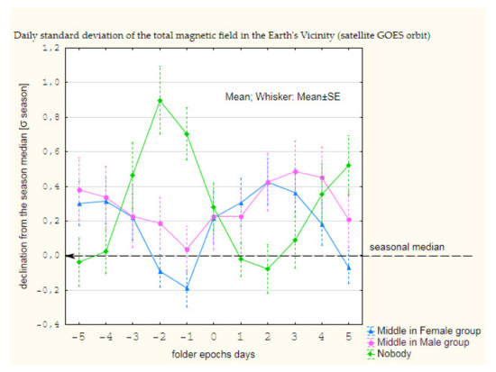 Solar data source: Space Weather Prediction Center—https://www.swpc.noaa.gov/, accessed on 21 December 2021; Satellite GOES data source: Space Weather Prediction Center—https://satdat.ngdc.noaa.gov/sem/goes/data/avg/, accessed on 21 December 2021; Ionosphere data source: Space Weather Prediction Center—https://www.ngdc.noaa.gov/stp/space-weather/ionospheric-data/sids/reports, accessed on 21 December 2021; Geomagnetic data source: INTERMAGNET—the global network of observatories monitoring the Earth’s magnetic field, Nurmijarvi observatory and Saint Petersburg observatory—www.intermagnet.org, accessed on 21 December 2021; meteorological data from the Saint Petersburg meteorology station, #26063, (59°58′ N 30°18′ E); medical data are available on request from the corresponding author.