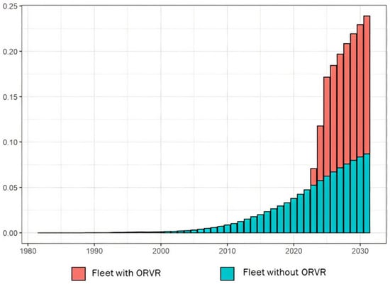 Fraction of the fleet of light vehicles in circulation (excluding scrapped vehicles) with and without ORVR in the year 2031.