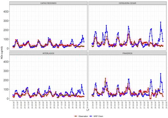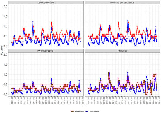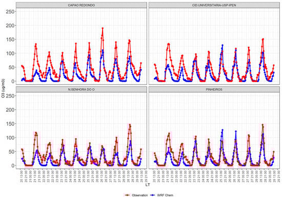 The meteorological simulation fields presented a very good agreement with observations especially for temperature and wind speed, as shown on Figures S1 and S2, and Table S1 (Supplementary Materials). Specifically, we found correlations above 0.9 for temperature and 0.7 for wind speed. As the main source of CO is vehicular emissions, having a good representation of the simulated concentrations of this gas is crucial to assess the inventory. Figure 3 shows the comparison between observations and simulations for CO concentrations (ppm) at CETESB stations of Parque D. Pedro II and Pinheiros. Our simulation has highest correlation for CO as 0.52, which means that the emissions estimation is reasonable, as is the diurnal and spatial representation. Similar results were found for other CETESB stations (not shown). In the same way, Figure 4 shows the results for NOx concentrations (μg/m3) for the stations Interlagos and Pinheiros. From these figures, we can see a very good agreement between modeled and observed values. Actually, the correlation values for NOX were around 0.7 with the highest value of 0.82, which is fundamental for a good representation of ozone for two main reasons. First, a good representation of CO concentrations shows us that the vehicular emissions are relatively well represented in the model, with a diurnal cycle of emissions, including rush hours. Second, NOx’s good performance will provide an appropriate base for the ozone precursors. These features contributed to the good representation of ozone concentrations, as one can see in Figure 5 for the stations of Capão Redondo, Cid.Universtiaria-USP-IPEN, Nossa Senhora do Ó and Pinheiros. The correlation values for O3 values were around 0.75 with the highest value of 0.83 in stations Ibirapuera and Pinheiros. The results obtained for CO, NOx, and O3 give us confidence in the model’s results for analyzing the future scenarios proposed in this work.