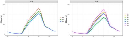 O3 (μg/m3) concentrations for scenarios in 2018 and 2031. Note that the meteorology of 2018 was used and the scenarios in 2031 are based on the emissions projected for the year 2031.
