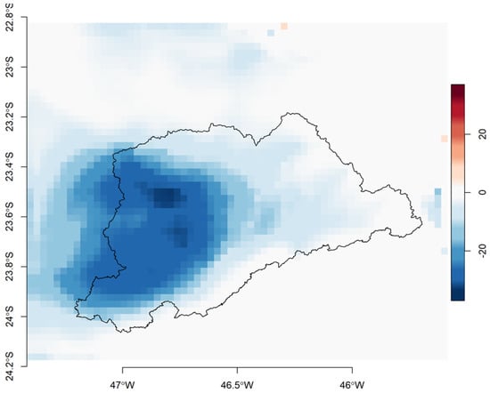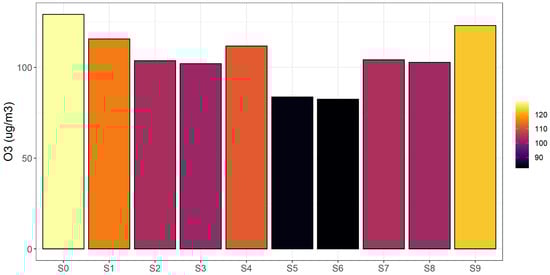 Figure 8 shows the mean difference of O3 concentrations (%) for the year 2031 between Scenarios S9 and S5. We can see that Scenario S5 will contribute to an O3 reduction of around 25% in west MASP. The spatial distribution of this reduction follows the local circulation which characterizes MASP. In particular, MASP is under influence of sea-breeze, cold fronts, and other atmospheric systems which transport MASP pollutants [,,], being very common the situation where higher concentrations are observed away from air pollutant sources.