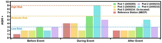 - Wildfire events in Northwestern Ontario were captured by the pod network at a high data resolution of 15 min. Comparing the AQHI+ values at each period in the event highlights the potential impact of local sources to add to, and exacerbate, regional effects.