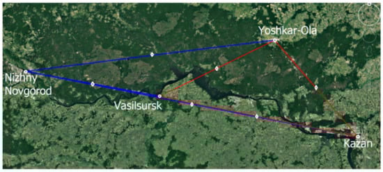 The geometry of the paths’ network for diagnosing the ionosphere using chirp signals is shown in Figure 1. White dots in the figure mark the locations of chirp stations: receiving and transmitting in the village of Vasilsursk, Kazan, and Yoshkar-Ola cities; receiving station in Nizhny Novgorod city.