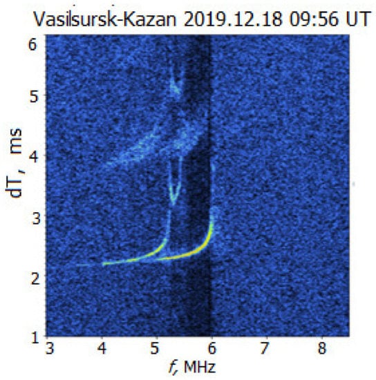 Note, the CADI ionosonde did not record the passage of the TID on 18 December 2019. Only weak diffuseness of 1–2 points [] was seen on ionograms up to 9:45 inclusive. At the same time, sickle-type TIDs were observed on 18 December in three ionograms on the paths Kazan-Nizhny Novgorod (with the midpoint of the path closest to Vasilsursk) and Vasilsursk-Nizhny Novgorod.
