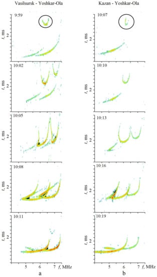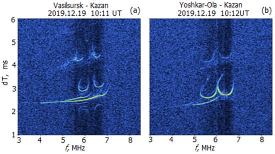 Ionograms for Vasilsursk-Yoshkar-Ola (a) and Kazan-Yoshkar-Ola (b) on 19 December 2019.