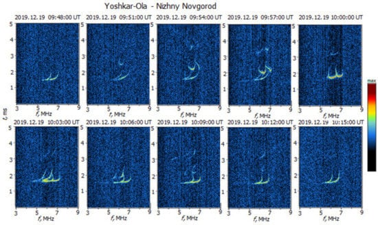 The work schedule of chirp stations for transmission is cyclical in the following order: the zero min corresponds to Yoshkar-Ola, the first min—to Kazan, the second min—to Vasilsursk, etc. Thus, the program repeatability was 3 min, and a frequency tuning rate of 110 kHz/s was used. The starting frequency was 3 MHz, and the ending frequency was 9 MHz on 18 December and 8.5 MHz on 19 December 2019. When the chirp station does not work on transmission, it receives the chirp signal reflected from the ionosphere. The station in Nizhny Novgorod city has been used as receiving station only. The chirp station of IZMIRAN was independently used for receiving the signal on 19 December 2019.