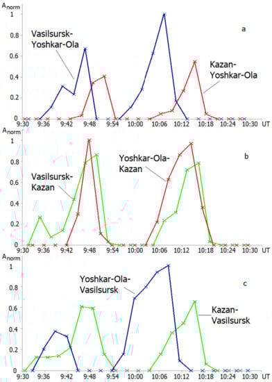 Results of measurements the normalized values of TID signal power on 19 December 2019, during time from 9:30 to 10:30 UT on the paths Vasilsursk-Yoshkar-Ola (a,c), Kazan-Yoshkar-Ola (a,b), and Kazan-Vasilsursk (b,c).