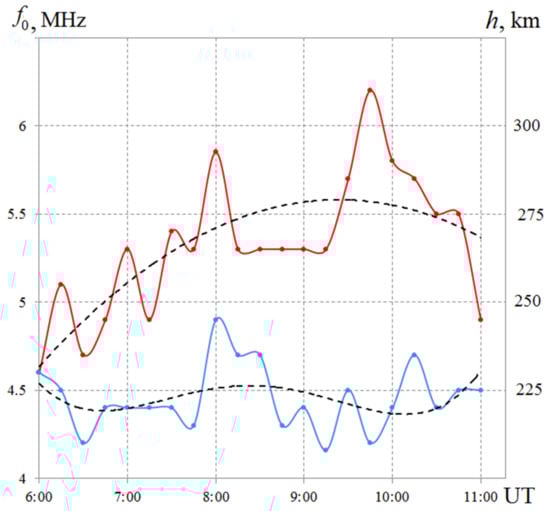 Figure 9 shows the graphs of the critical frequency F2 behavior and the true reflection height h in time for the period from 6 to 11 UT. The graphs are supplemented with approximation curves with polynomial dependence of the 2nd (critical frequency) and the 4th (true reflection height) orders.
