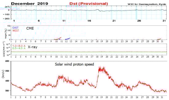 The Sun can be considered very calm in the period of December 2019: not a single active region (AR) was observed until December 25, and even weak flares were not recorded in the two ARs that appeared later []. No changes were recorded in the X-ray radiation of the Sun, which characterize the flare activity (Figure 10). Small number of CME has been recorded by LASCO []. At the same time, on 18–19 December, the passage of a high-speed solar wind flux at a speed of about 550 km/s was recorded []. The geophysical environment on 18–19 December 2019 was quiet, as well (see Figure 10). The maximum value of the Dst index (18 nT) was registered on 18 December at 03:00 UT. The minimum values were observed on 18 December at 19:00 UT (−28 nT), and on 19 December at 13:00 UT (−26 nT) []. Such DST values are less than even those that describe moderate geomagnetic storms (below then −50 nT). The Kp index reached its maximum value of 4 on 18 December at 15:00 UT [].