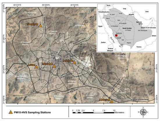 The sites for PM10 samples collection were selected to represent the major activities in Makkah (Figure 1). The Holy City of Makkah is one of the most densely populated cities in Saudi Arabia, and according to the general authority for statistics of the Kingdom of Saudi Arabia [20], its population is more than 8.5 million, with a growth rate of 1.8%. In addition, every year, millions of Muslims from all over the world visit Makkah to perform Hajj and Umrah. Due to its hot arid nature, the annual mean temperature in Makkah is 31.42 °C, and the maximum temperature reaches over 55 °C in hot months of the year [21]. Its climate is dry, receiving very little rain every year. The city is expanding rapidly, and different towns around Makkah share its characteristics of multistorey buildings, fewer or no trees except date palms, and being busy all year round in terms of national and international visitors. However, in terms of road traffic, the central region of Makkah is busier than the surrounding outskirts. For example, Misfalah and Aziziyah are considered the busiest, whereas Abdeyah and Sanaiyah are relatively quieter. Samples were collected at residential, central urban, industrial, traffic, and background areas. PM10 samples were collected at five monitoring sites, namely, Aziziyah (urban traffic area), Misfalah (central urban area), Sanaiyah (industrial area), Askan (residential area), and Abdeyah (background area).