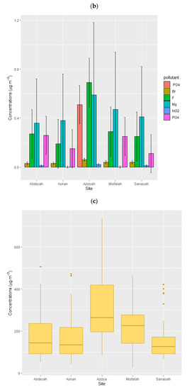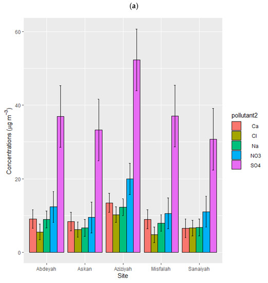 Levels of PM10 and cations and anions are depicted in Figure 2, which shows that not only the levels of PM10 but also the levels of cations and anions are higher at the Aziziyah site. Cations and anions are divided into two subgroups based on their levels (Figure 2). These subgroups are referred to as major and minor ions in this study. The major ions are chloride (Cl−), sodium (Na+), calcium (Ca2+), nitrate (NO3−), and sulphate (SO42+), in ascending order of their levels in PM10. Among the major ions, Cl− has the lowest levels ranging from 4.73 to 10.21 (µg/m3), and SO42− has the highest levels ranging from 30.75 to 52.32 (µg/m3). The minor ions are nitrite (NO2−), bromide (Br−), phosphate (PO43−), fluoride (F−), and magnesium (Mg2+). NO2− has the lowest levels ranging from 0.01 to 0.02 (µg/m3), whereas Mg2+ has the highest level ranging from 0.36 to 0.59 (µg/m3). Minor ions are all in fractions and are presented in a separate panel of Figure 2. Mohammed et al. [33] analysed various cations and anions in PM10 (along with PM2.5 and total suspended particulates) in Makkah and reported that NO3− and SO42− were the most dominant anions in PM10. In the current study, the average concentrations of SO42− and NO3− in PM10 were 40.35 and 17.26 (µg/m3), respectively, whereas according to Mohammed et al. [33], SO42− and NO3− levels were 21.8 and 5.5 µg/m3, respectively. Both studies show that SO42− levels are higher in PM10 than the NO3− levels. The levels of both NO3− and SO42− reported in the current study are higher than those reported by Mohammed et al. [33]. Changes in the levels and proportion of ions in PM10 are expected as pollutant levels, and emission sources may change both in time and space. It should be noted that Mohammed et al. [32] had collected PM10 samples at a single rural site in Mina during the Hajj period, whereas in this study, samples were collected from five sites, mostly urban, which explain why the levels are higher in this study. Furthermore, in the present study, we used data for a whole year, whereas Mohammed et al. [32] collected samples for just a single week.