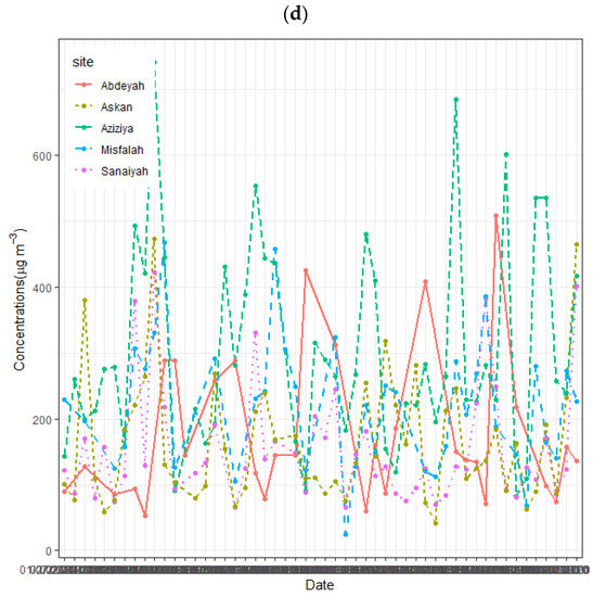 Comparing the levels of different ions using bar plots (a,b), PM10 concentrations using box plots (c), and time series of PM10 (d) at different sites in Makkah. The lower end of the box shows 1st quartile, the upper end of the box shows 3rd quartile, and the horizontal line in the middle of the box shows the median of the data. The top and lower ends of the vertical orange line show maximum and minimum values, respectively, whereas the dots above the vertical line shows outliers.