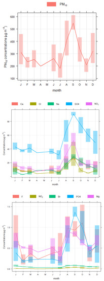 Several compounds, which are part of the PM10, have been reported e.g., [53,54,55] to be adsorbed on quartz or glass fibre filters including PAH, formaldehydes, and n-butanes, which might affect the levels of PM10 and its ionic constituents. The work is still ongoing, and we aim to further analyse the metal contents of the PM10, which will provide a greater insight into the emission sources of PM10.