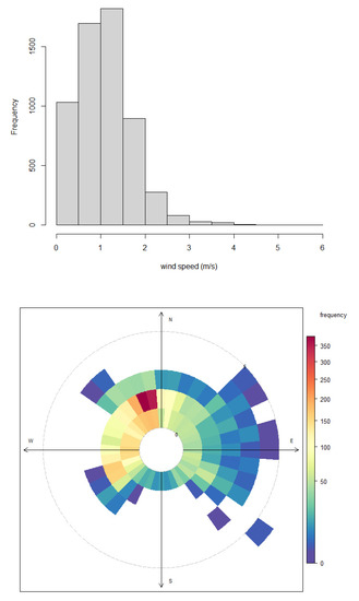 A histogram (Figure 4, upper panel) of wind speed during 2020 shows that most of the time wind speed (m/s) was 0.5–1.0 and 1.0–1.5, which had a frequency of 1695 and 1816, respectively. The maximum wind speed was 6 m/s; however, the frequency of wind speed greater 3 m/s was very low. Wind speed (m/s) from 3.0–3.5, 3.5–4.0, and 4.0–6.0 had a frequency of 29, 20, and 7, respectively. Figure 4 (middle panel), showing the polar frequency plot, demonstrates the highest frequency in the northwest direction (north-westerly wind). The effect of wind speed and wind direction depends on the distance and direction of the emission source from the receptor point (the monitoring site). Generally, high wind speed disperses locally emitted pollutants but also brings along pollutants from the upwind areas.