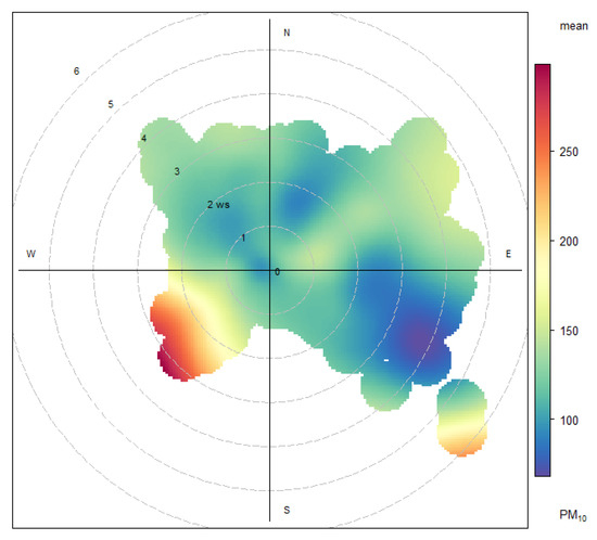 The polar plot (Figure 4, lower panel) shows that high PM10 concentrations (>150 µg/m3) are positively associated with the southwesterly wind with 1–3 m/s speed. This is probably due to the fact that southwesterly wind brings emissions from Taif road and the sandy deserts in this direction. Northeasterly winds with a high wind speed (roughly 3–5 m/s) are also associated with relatively high PM10 concentrations (approximately 100–150 µg/m3).
