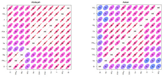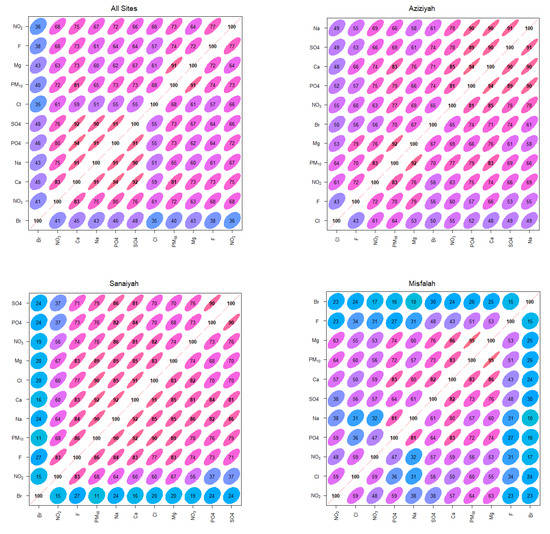 Correlation analysis was performed to see how different ions correlate with each other and with PM10 (Figure 5). Firstly, the data from all sites were pooled into a single table, and then correlation analysis was performed (Figure 5). In addition, correlation analysis was performed for each site separately to see how the correlation varies spatially at different monitoring sites (Figure 5). In pooling the data, this study followed the criteria of Khodeir et al. [14], who also pooled data of particulate matter and its constituents collected at several sites in Jeddah, Saudi Arabia. The purpose of pooling data from several sites is to increase the number of samples in the dataset, which enhance the statistical power of the analysis. Pooling can also help determine the common emission sources of all sites in a city. Correlation plots of individual sites have different shapes and colours probably caused by variations in local emission sources, land-use, geographical conditions, and microclimatic characteristics. The values of correlation coefficients slightly varied at different sites. For example, Abdeyah showed a slightly stronger correlation, whereas Misfalah showed weaker correlations compared to the other sites (Figure 5). Misfalah is located inside Makkah city and continuously remains busy in terms of road traffic, shops, and hotels. In contrast, Abdeyah is located outside Makkah city in the southeast direction in a suburban location. Misfalah is walking distance (about 2 km) from Al-Haram (the Holy Mosque), whereas Abdeyah is situated approximately 16 km from Al-Haram. Therefore, these two sites have totally different emission and dispersion characteristics, which control the levels and composition of air pollution.