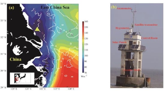 Errors can be found and identified by direct comparisons between point-to-point observations and flux products [10,12,26,27], which helps illuminate the uncertainties in products and increase confidence in their use. In a recent study by Song and Yu [28], it was found that, compared with low-resolution models, high-resolution models can resolve the complex coastline and provide more physically reasonable surface heat flux estimates. It is suggested that the air-sea heat fluxes along a coast with complex geography and air-sea interaction processes should have a significant effect on the regional and global energy balance. The near-coast platform observations fastened to the seabed in the East China Sea (ECS, Figure 1a) provide reliable air-sea variables that can be used to diagnose current products of wind stress and turbulent air-sea heat fluxes. Yet, such work has seldom been done in this region. The main objectives of the platform location selection in this study are as follows: First, the platform provides the opportunity to diagnose the wind stress and turbulent heat flux estimates in atmospheric reanalysis and objectively analyzed products in the coastal region, where the land–sea mask boundary is located. This will help assess the model’s ability to resolve land–sea interactions at a high frequency. Second, this platform provides the basis for the comparisons between models and observations under lower air-sea turbulent heat fluxes (Figure 1a, coloured background) on the continental shelf, where the sea surface temperature (SST) is relatively lower than that in the open ocean or even in the Kuroshio Current in the ECS.
