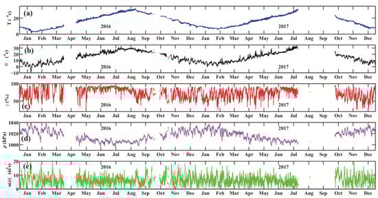 Figure 3 shows the two-year time series of air-sea variables of SST (T), SAT (), RH (), SLP (), and WS (), which can be used to estimate the air-sea momentum fluxes. The two-year mean, maximum, and minimum T (Figure 3a) were 16.2 °C, 32.4 °C, and 1.1 °C, while the two-year mean, maximum, and minimum were 15.0 °C, 33.8 °C, and −10.4 °C, respectively. The mean (Figure 3b) was less than the mean T, indicating that heat loss occurred moving from the ocean to the atmosphere by heat conduction, namely, . However, due to synoptic weather processes, the maximum was higher than the maximum T. Both T and showed significant seasonal cycles from 2016 to 2017. The SST demonstrated a clear diurnal cycle, while , which exhibited peaks, was mostly affected by synoptic-scale weather processes. The mean RH () was 74%. The SLP () was lower in the warm season from May to October than in the cold season. Unlike the other variables, WS (Figure 3e) did not show any particular cycles over the two-year duration, although peaks were occasionally associated with synoptic-scale processes. These five key air-sea parameters provide the basis for calculating the traditional momentum and turbulent heat fluxes.